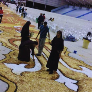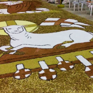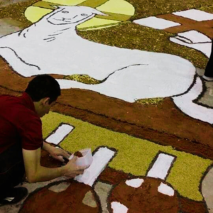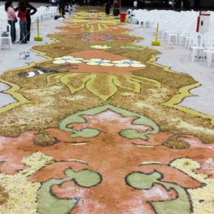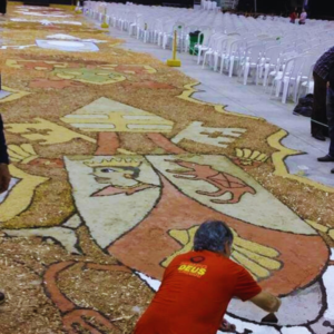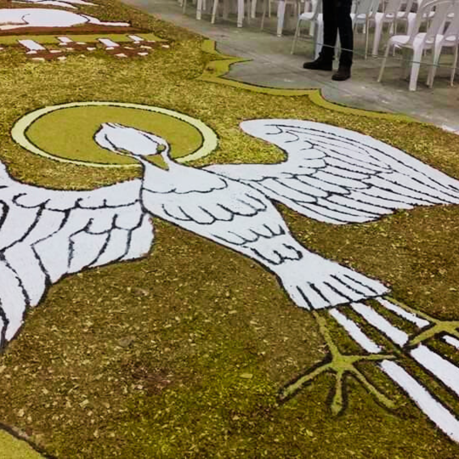 A festa de “Corpus Christi” celebrada pela Igreja Católica, tem como tradição a confecção de desenhos do tapete criados com a aplicação de arabescos, que retratam principalmente os símbolos da Eucaristia.